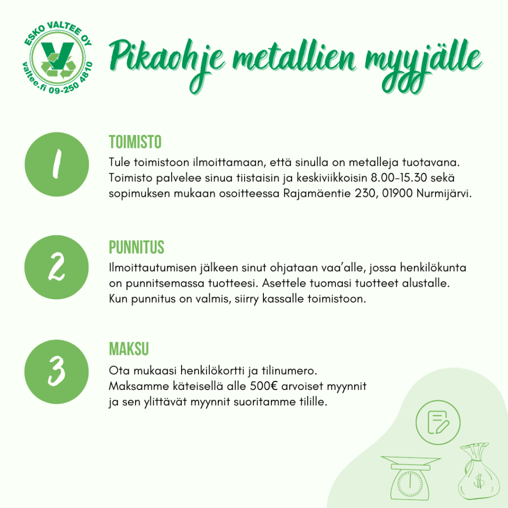 Metallien ostopiste avoinna ti-ke 8.00-15.30 ja sopimuksen mukaan.